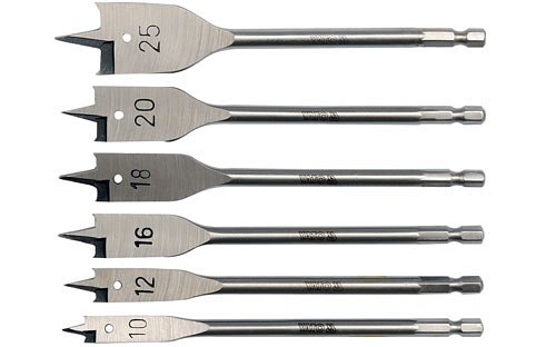 Sada 6 kusů kvalitních plochých vrtáků z nástrojové oceli pro vrtání dřeva.