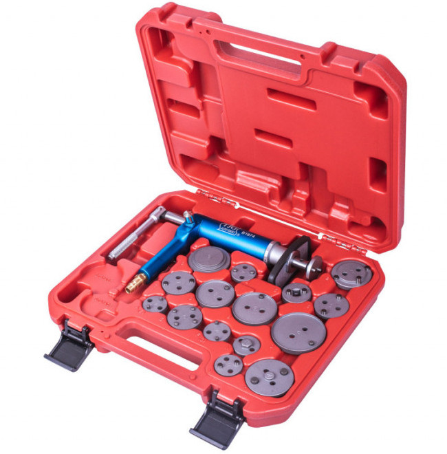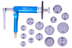 Pneumatická sada k zatlačení brzdových pístků, 15 adaptérů pro většinu známých značek vozů, dodáváno v plastovém kufříku.