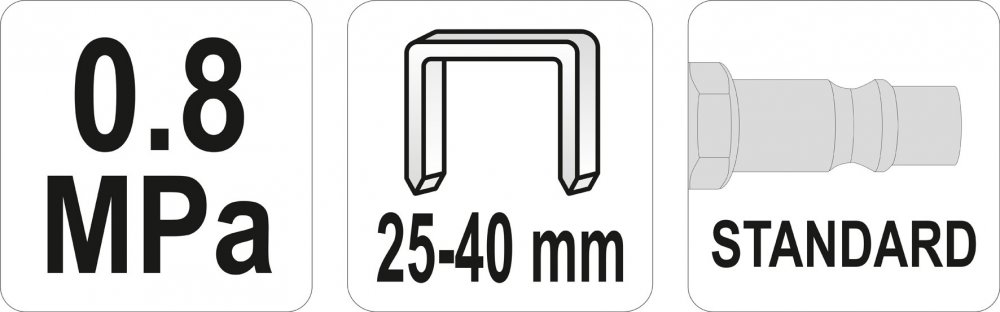 Vhodné pro sponky se šířkou 5,7 mm a s výškou od 25 do 40 mm. Opatřeno přípojkou 1/4", spoušť je opatřena pojistkou chránící před náhodným spuštěním.