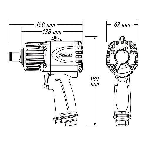 vývod max. utahovací moment max. povolovací moment otáčky provozní tlak vzduchu spotřeba vzduchu hladina hluku vibrační zrychlení připojení stlačeného vzduchu průměr vzduchové hadice délka hmotnost | 3/4" (20 mm) čtyřhran 1300 Nm 1890 Nm 8000 / min 6,3 bar 2,5 l / s 99,3 db(A) Lp A 11,39 ms-2 vnitřní závit 12,91 mm (1/4“) 10 mm 160 mm 1,7 kg |