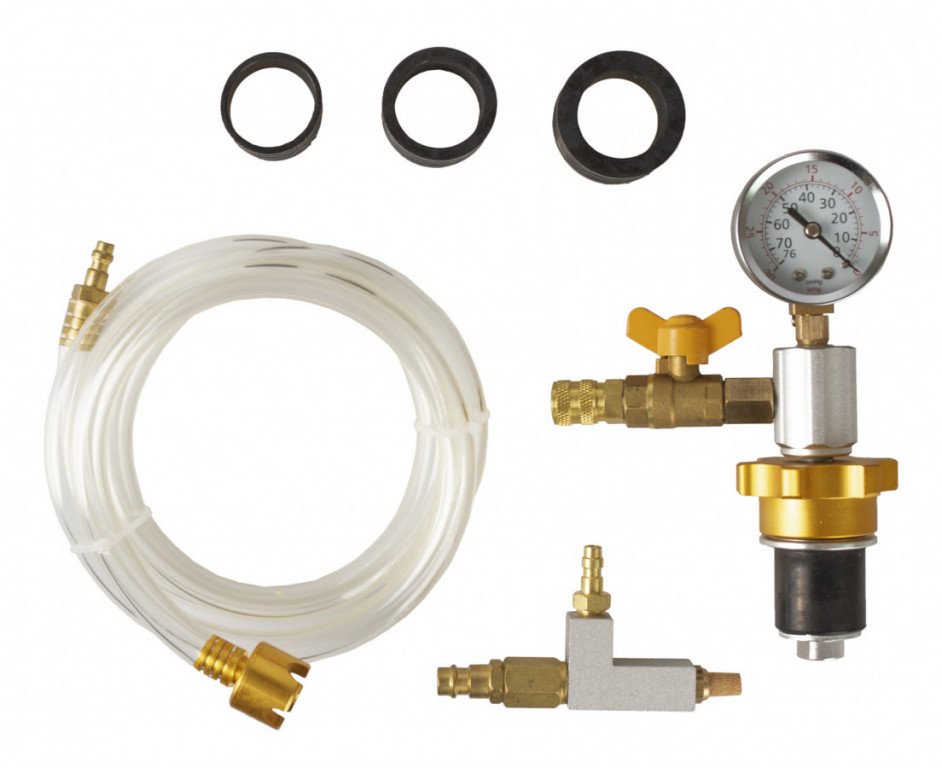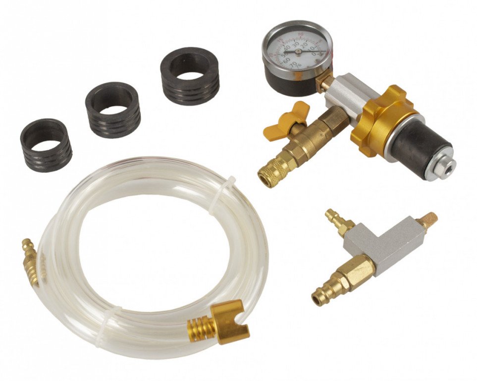 Po připojení kuželového adaptéru s manometrem k vyrovnávací nádržce chladící kapaliny připojíte hadici stlačeného vzduchu k přístroji a vytvoříte podtlak v systému.