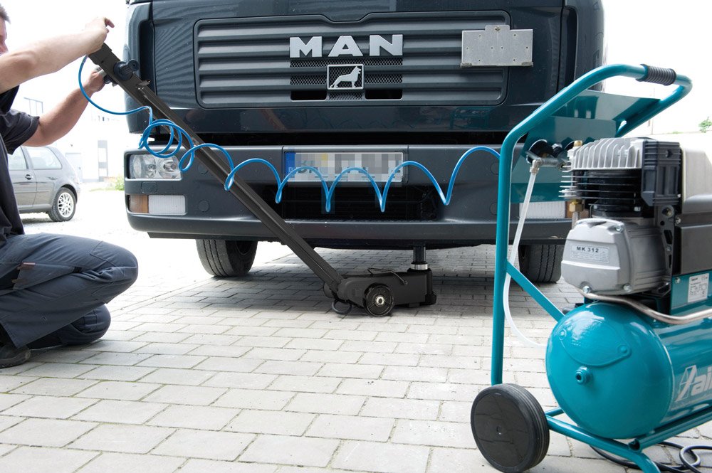 Pneumaticko-hydraulický zvedák pro bezpečné a kontrolované zvedání a spouštění vozidel v dílně se zvedací silou až 30 tun.