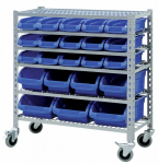 Regál s plastovými boxy je osazen 4 koly s možností aretace, z toho jsou 2 otočné.