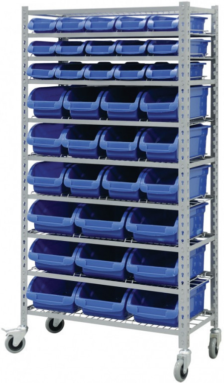Kovový regál je osazen 10 ks pozinkovanými drátěnými policemi s vodícími kolejnicemi pro plastové boxy a stropem ve stejném provedení. Samotné skladové nádoby jsou z odolného plastu pro dlouhou životnost a jsou uzpůsobeny pro snadné vkládání a odebírání obsahu.