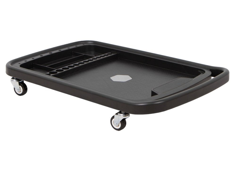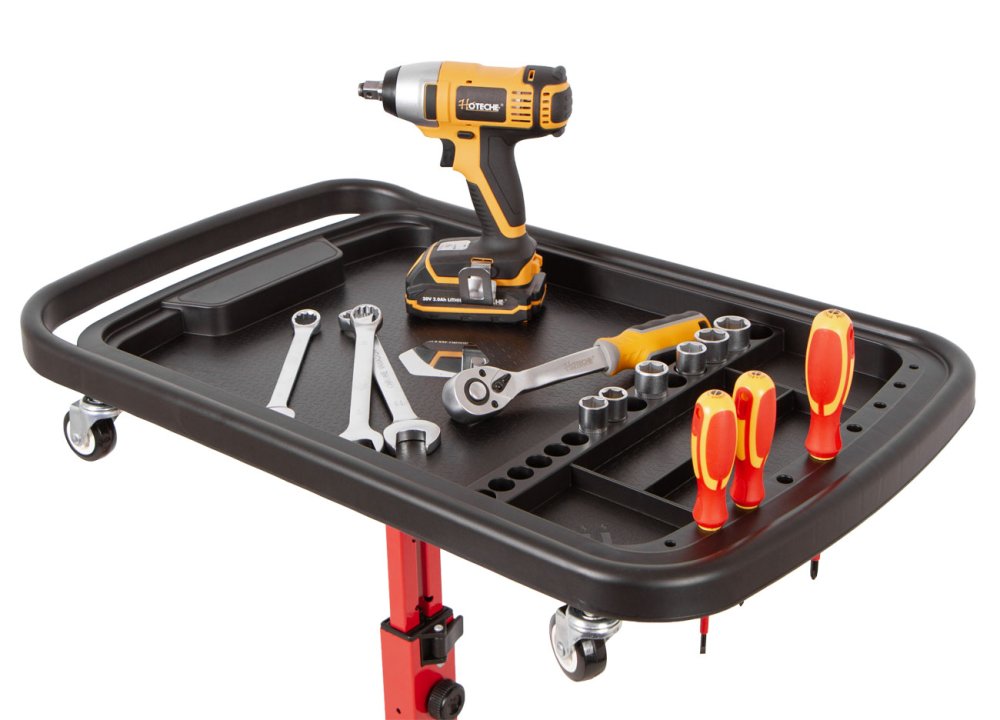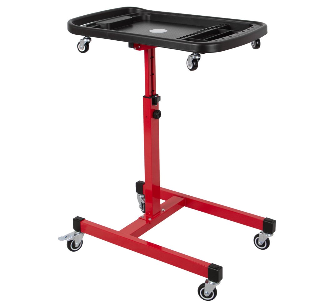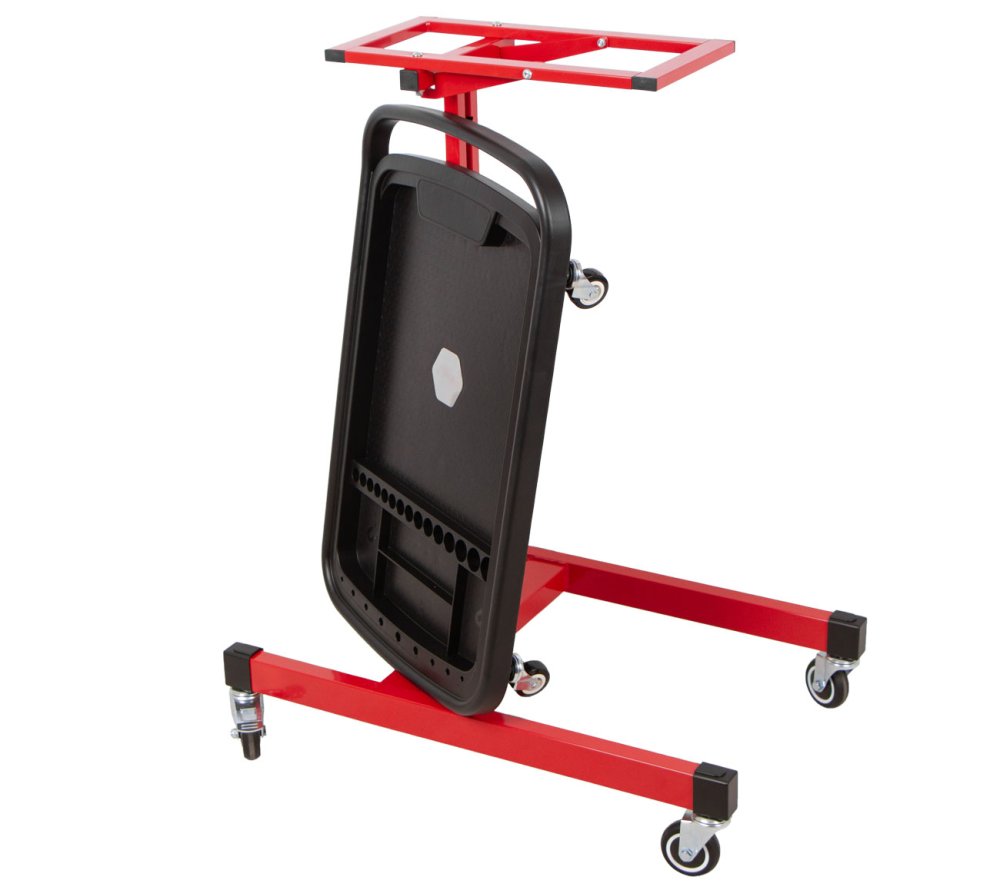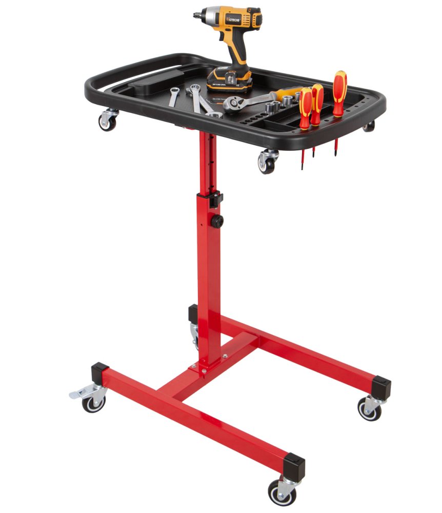 Pojízdný odkládací montážní stolek pro organizaci nářadí a drobných součástek při práci v dílně, garáži i mimo ni.