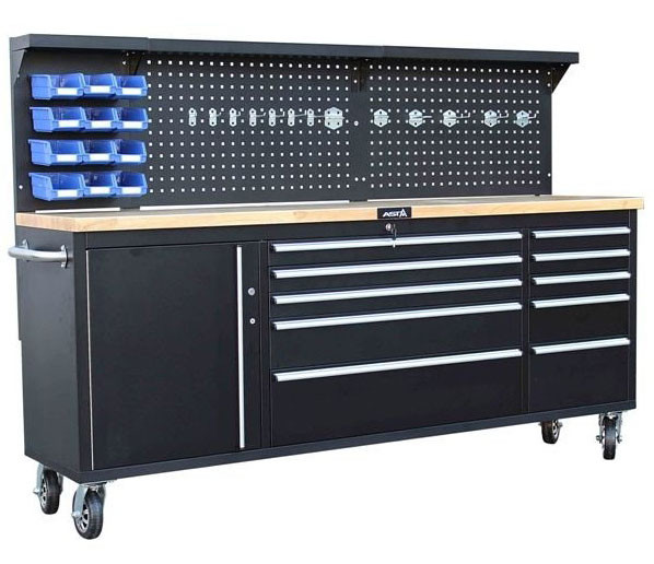 Profesionální dílenský pojízdný pracovní stůl/vozík s integrovanou zadní děrovanou deskou pro zavěšení nářadí.