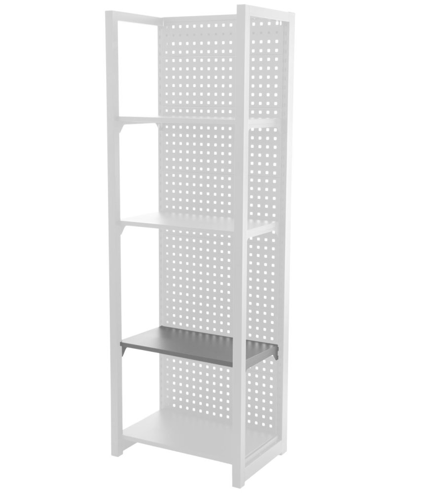 Součástí balení je samotná police a dvojice držáků pro její upevnění na konstrukci regálu s děrovanou deskou, což usnadňuje montáž i případné přemístění police.
