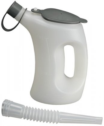 Kvalitní polyetylenová odměrná konev / nádoba s oddělitelným pružným výtokovým nástavcem (délka 160 mm), s víčkem a ochranným víčkem na výtoku je opatřena odměrnou stupnicí po 0,5 l. Dobře odolává olejům, kyselinám, pohonným hmotám a prasknutí.