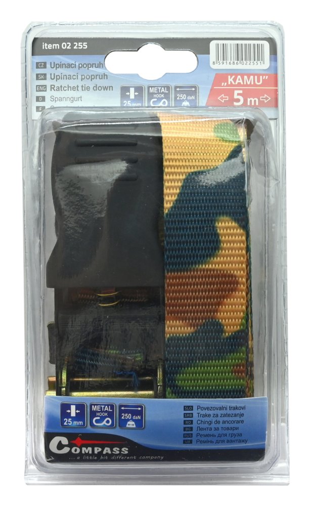 Popruh s kamufláží má šíři 25 mm, délku 5 m a vyznačuje se tažnou silou 250daN.