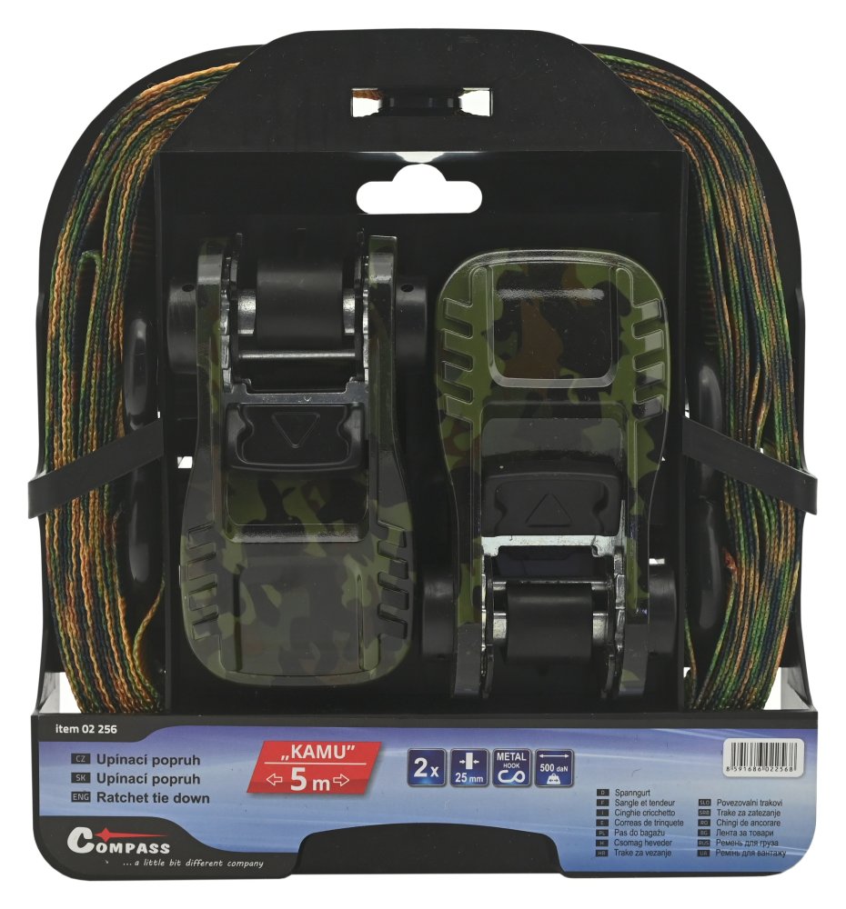 Popruhy s kamufláží mají šíři 25 mm, délku 5 m a vyznačují se tažnou silou 500daN.