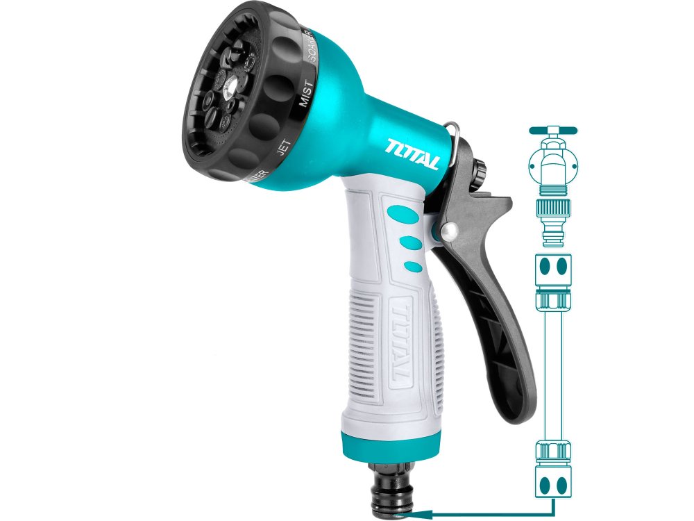 ergonometrická rukojeť pro pohodlné držení pro 3/4" hadici 9 různých profilů stříkacích trysek s možností rychlého přenastavení vysoce odolné ABS plastové tělo