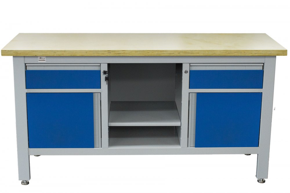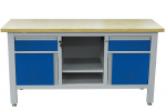 Stůl je vybaven pracovní deskou z masivního dřeva, 2 zásuvkami, 2 skříňkami a úložným prostorem s policí pro přehledné uložení nářadí a materiálu.