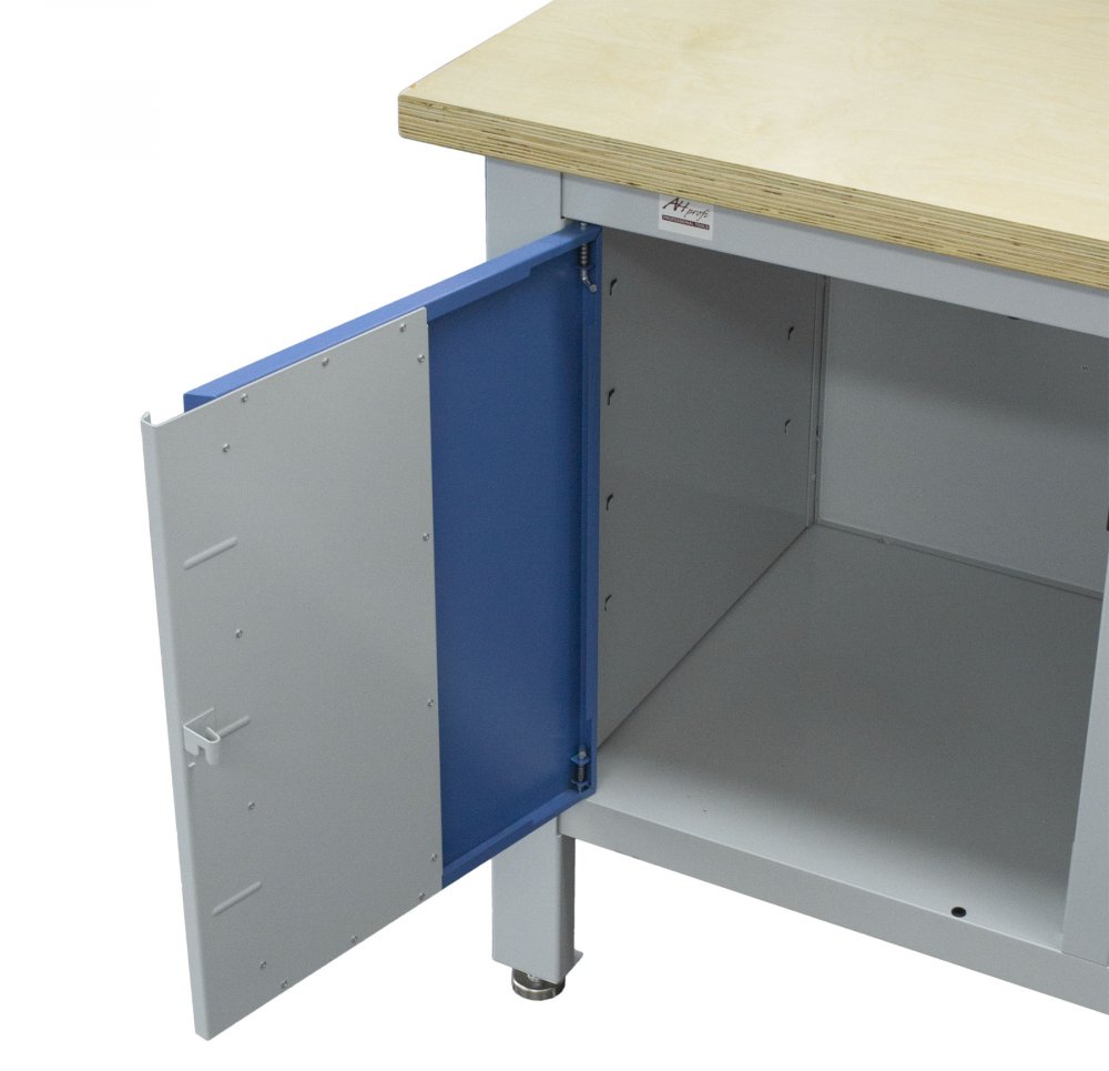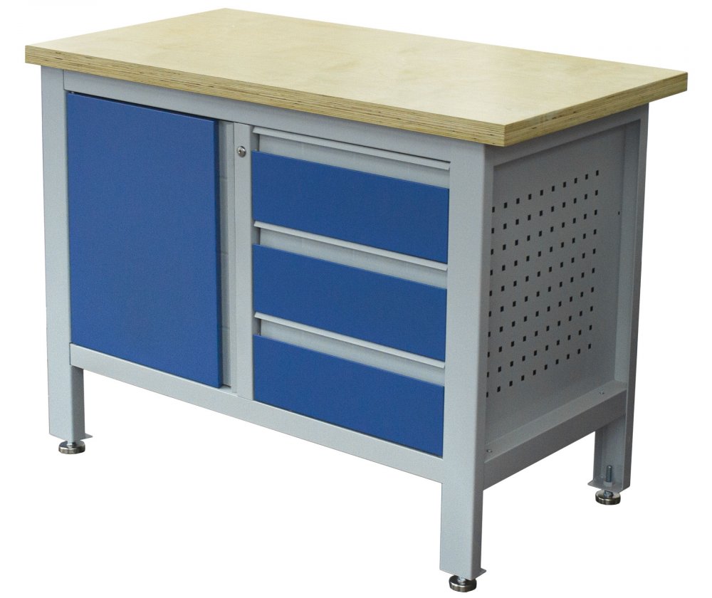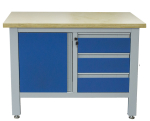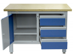 Profesionální kovový pracovní stůl se třemi zásuvkami a skříňkou, pracovní deskou z masivního dřeva a speciální odolnou povrchovou úpravou.