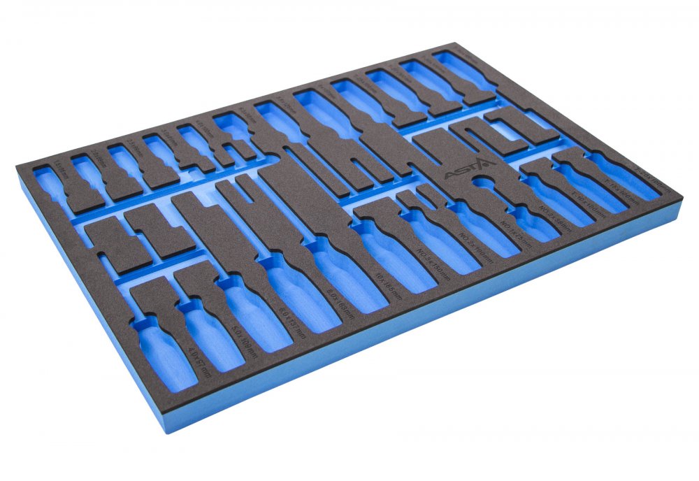 Prázdná pěnová vložka pro šroubováky. Vložka najde využití při organizaci vašeho nářadí v dílenských vozících nebo pracovních stolech.