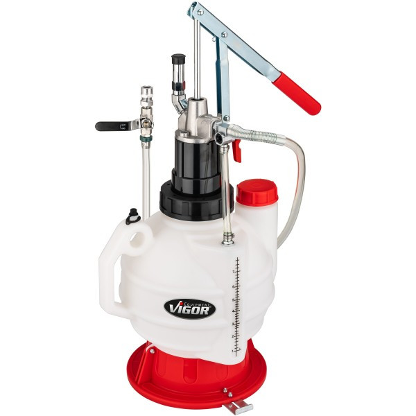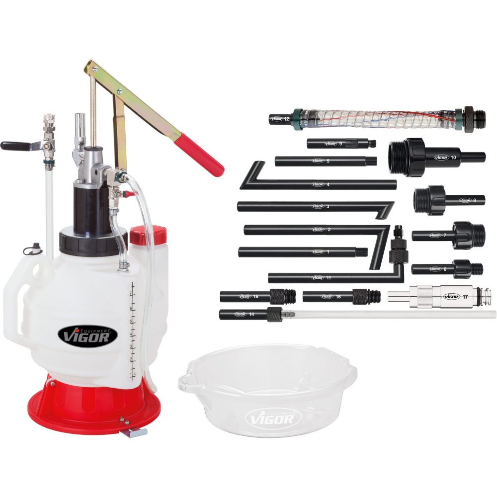 Ruční plnička s pákovým čerpadlem o objemu 7,5 l, 16 ks adaptérů a průhlednou hadicí o délce 1,6 m.