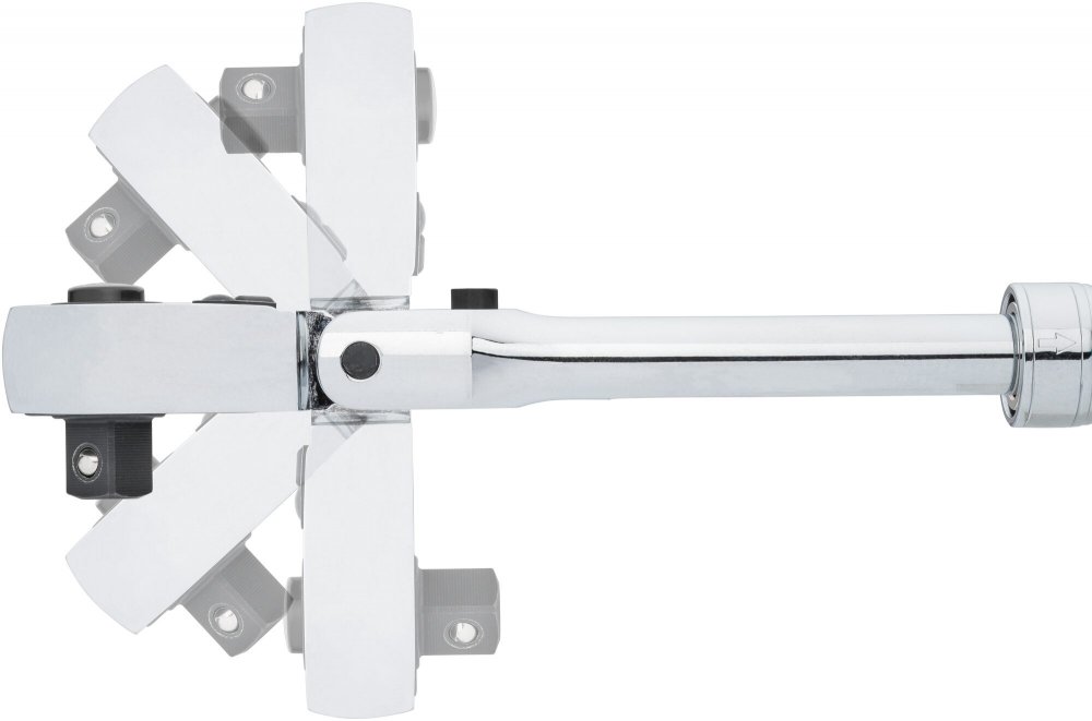 Teleskopická, kloubová, přepínací ráčna 3/8" o délce v rozmezích 250-350 mm. 5 stupňů aretace a otočná hlava o 180°.