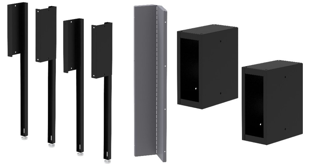 Obsahuje 2x 2 prodlužovací sloupky TSB131, které navýší hloubku skříňky, 1 ks středového rohového spojovacího dílu pro perforované desky a 2 ks distančních modulů pro horní rohovou skříňku.