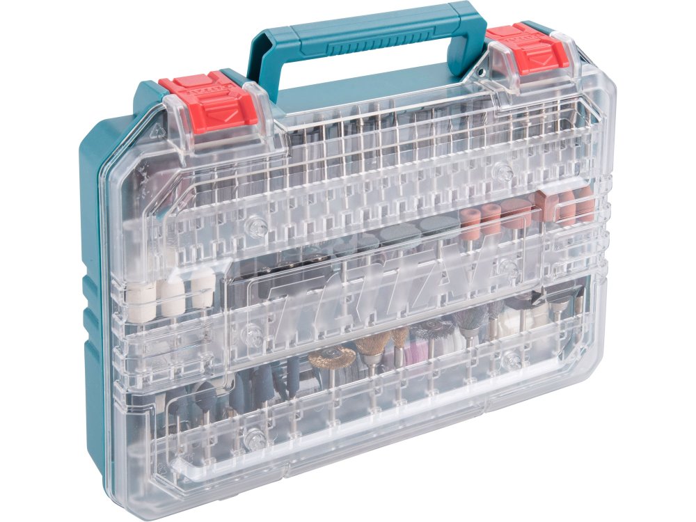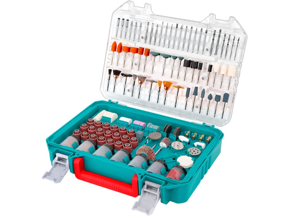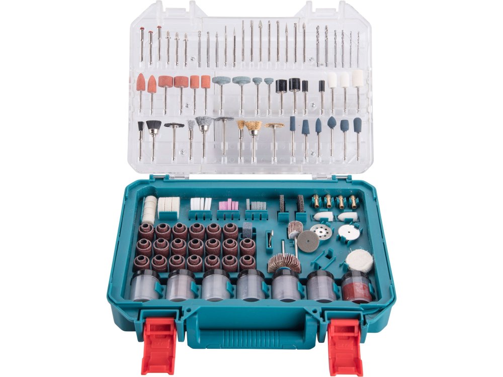 Velké příslušenství k přímé brusce. Obsahuje: 40ks Pískový kroužek, 7 ks sukně, 2ks Kulová plsť, 1 ks látkové kolečko, 4ks Gumový leštící kotouč, 6ks spirálový vrták, 3ks fréza, 1ks Diamantový pilový kotouč, 1ks Pilový kotouč z nerezové oceli, 3ks Pevná tyč pro brusný kotouč10ks King Kong brusná jehla, 10ks Diamantová brusná hlava, 9ks Brusná hlava9 ks štětce, 4 ks sklíčidla, 6ks Řezný kotouč, 1ks Gumový brusný kotouč, 18ks Brusný kotouč bez tyče, 1ks Brusný kámen, 2ks S oběžným kolem tyče set,1ks klíč, 120ks Kus brusného kotouče, 157ks Brusný papír, 1 ks pasty, 3ks Nestandardní závitový bit. Baleno v plastové krabičce