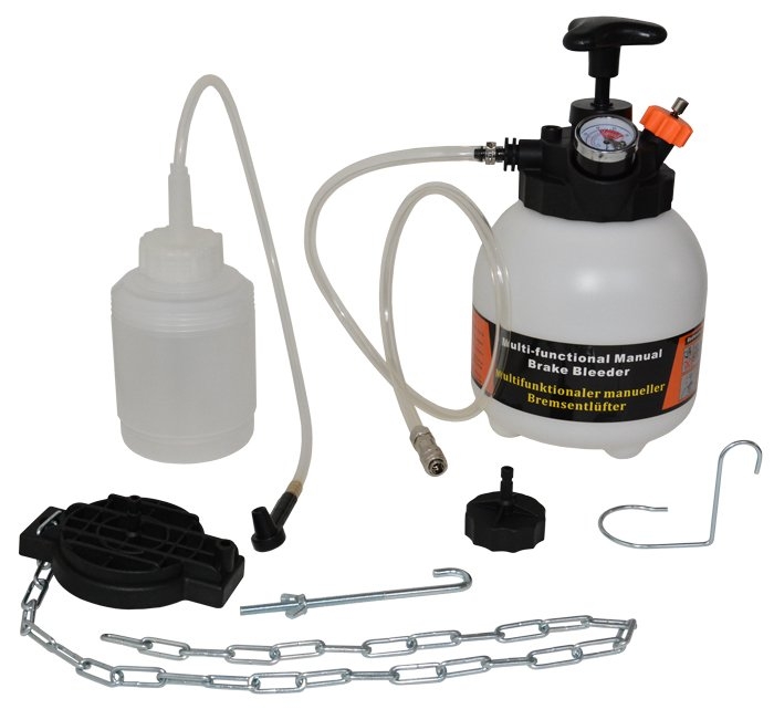 Sada pro odvzdušňování brzdových a spojkových systémů s ruční pumpou, tlakoměrem, nádržkou 3 l, Euro-adaptérem, univerzálním adaptérem s řetězem, hadicí a záchytnou nádobou.