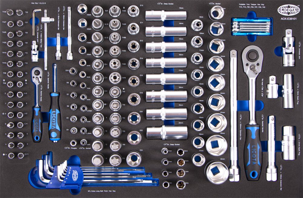 Pěnová výplň montážních vozíků s obsáhlou gola sadou 1/4 a 1/2", profesionální značka LICOTA, celkem 148 kusů nářadí.