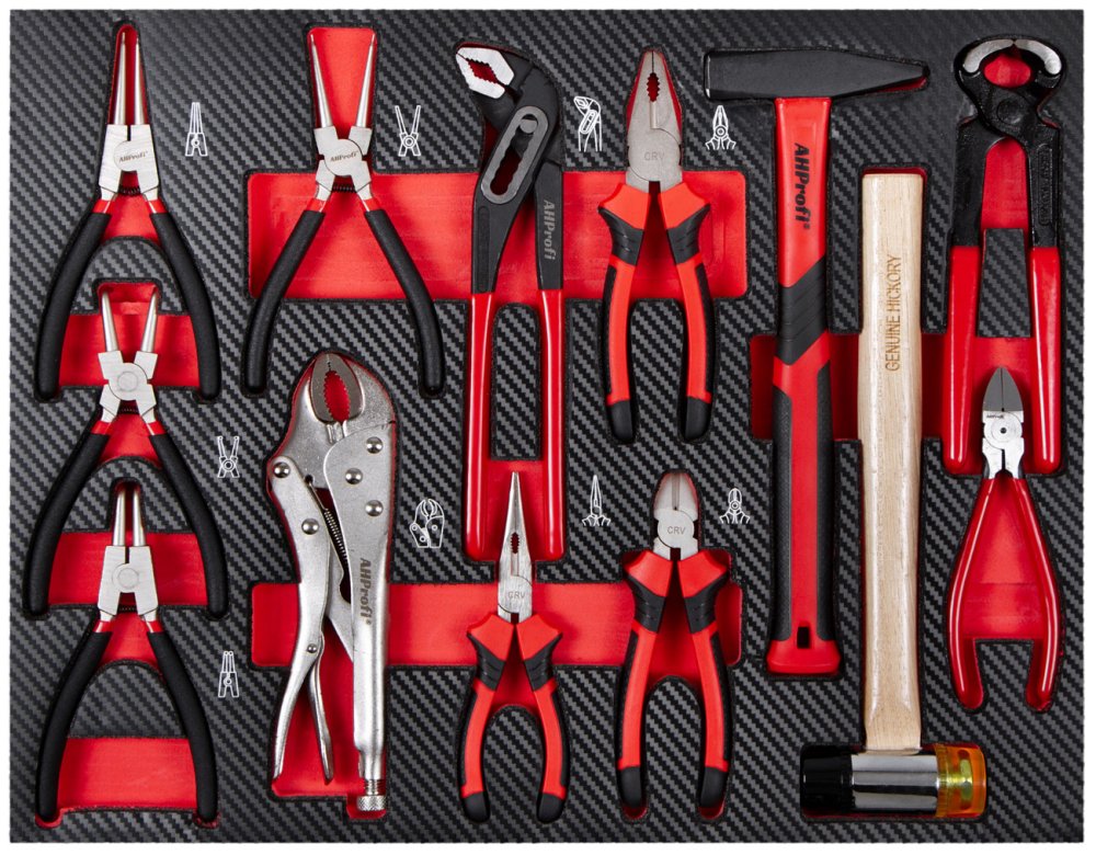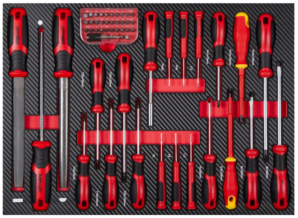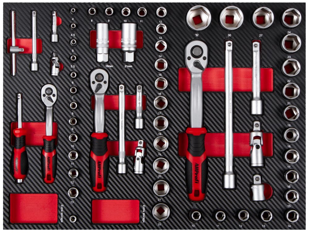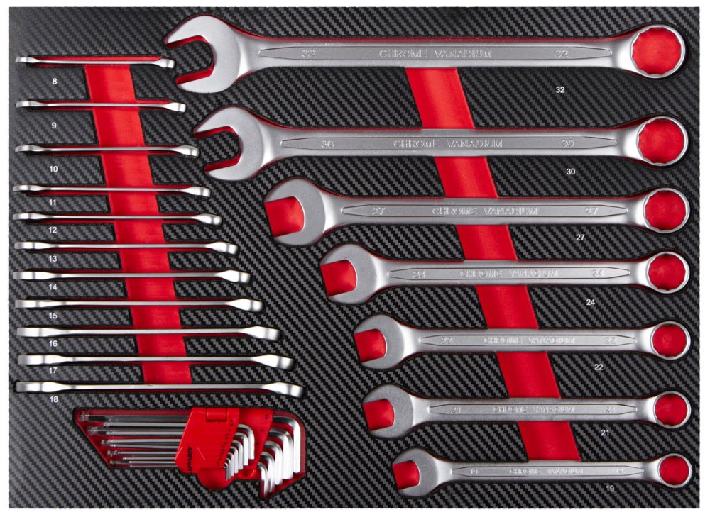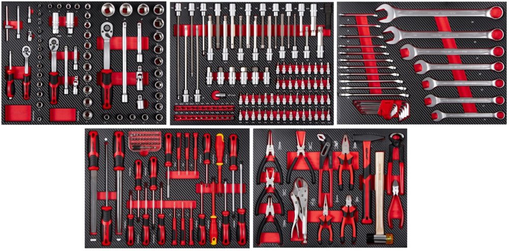Sada profesionálního nářadí v 5 pěnových výplních do dílenských vozíků a ponků, je určená pro každodenní používání s ohledem na potřeby profesionálních dílen, kde je vyžadován nepřetržitý provoz.