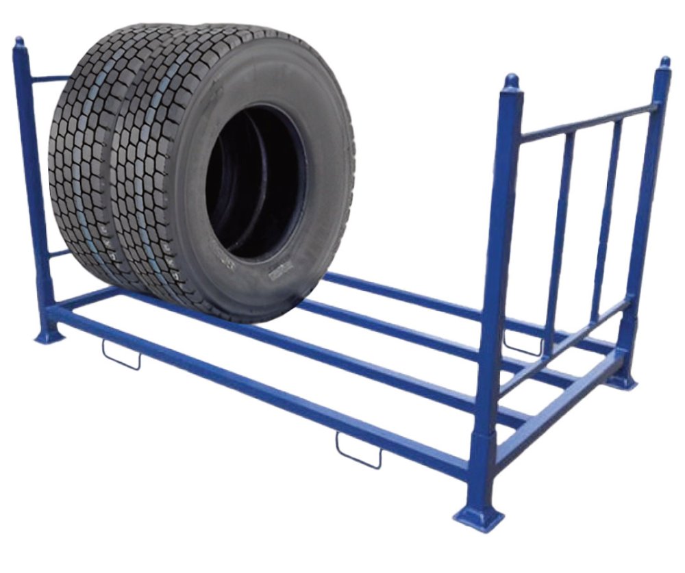 Robustní ocelový regál na skladování pneumatik nákladních automobilů.