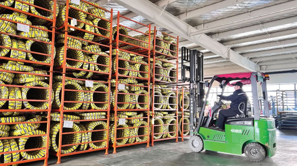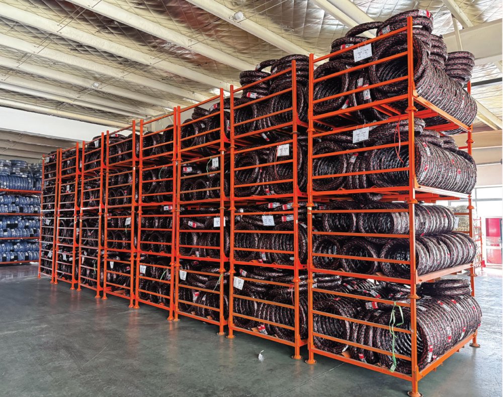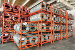 Robustní ocelový regál na skladování pneumatik osobních nebo dodávkových automobilů.
