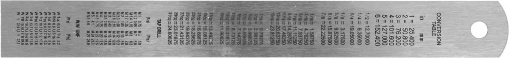 Na obou okrajích je milimetrová stupnice. Na druhé straně je převodní tabulka hodnot závitů.