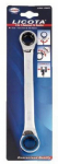 Očkový ráčnový klíč oboustranný 4 v 1, s velikostmi 14, 17, 18 a 19 mm a délce 225 mm. Obě ráčny jsou s přepínáním směru záběru.