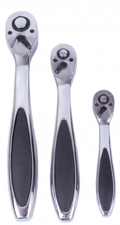 Celokovové pochromované ráčny, sada 3 kusů 1/4", 3/8", 1/2" v plastovém kufru. 72 zubů, pravý i levý chod, ergonomické protiskluzové rukojeti, celokovové tělo s chromovaným povrchem.