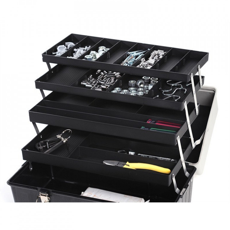 Kvalitní prostorný rozkládací kufr na nářadí se 4 patry přihrádek s celkovým objemem 14 litrů a rozměry 426 x 225 x 235 mm.
