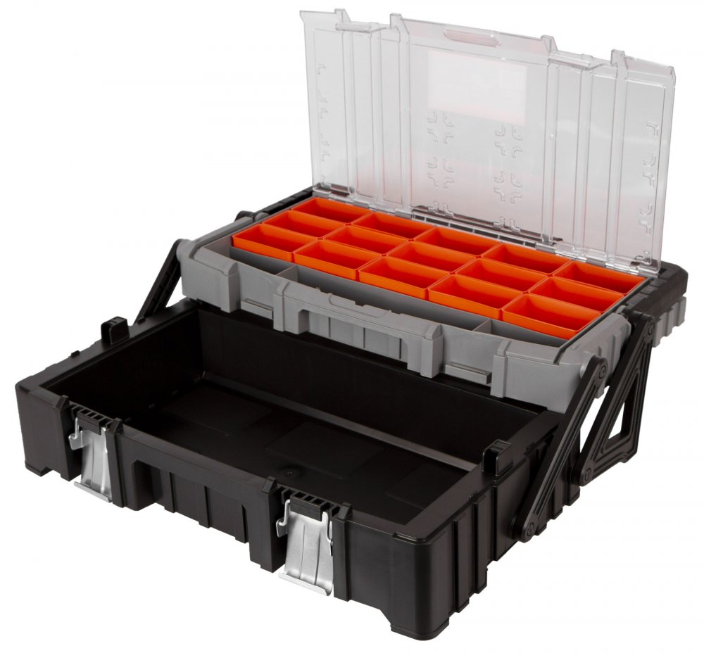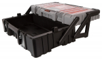 Rozkládací plastový kufr na nářadí o rozměrech 560 x 305 x 165 mm.