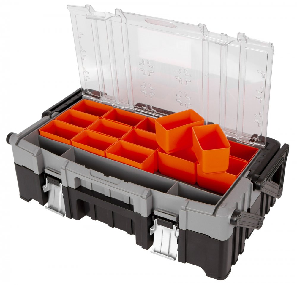 V horní části kufru se nachází organizér na drobný materiál v podobě 15-ti vyjímatelných přihrádek.