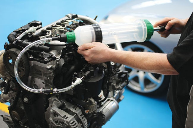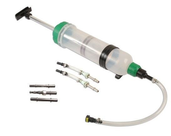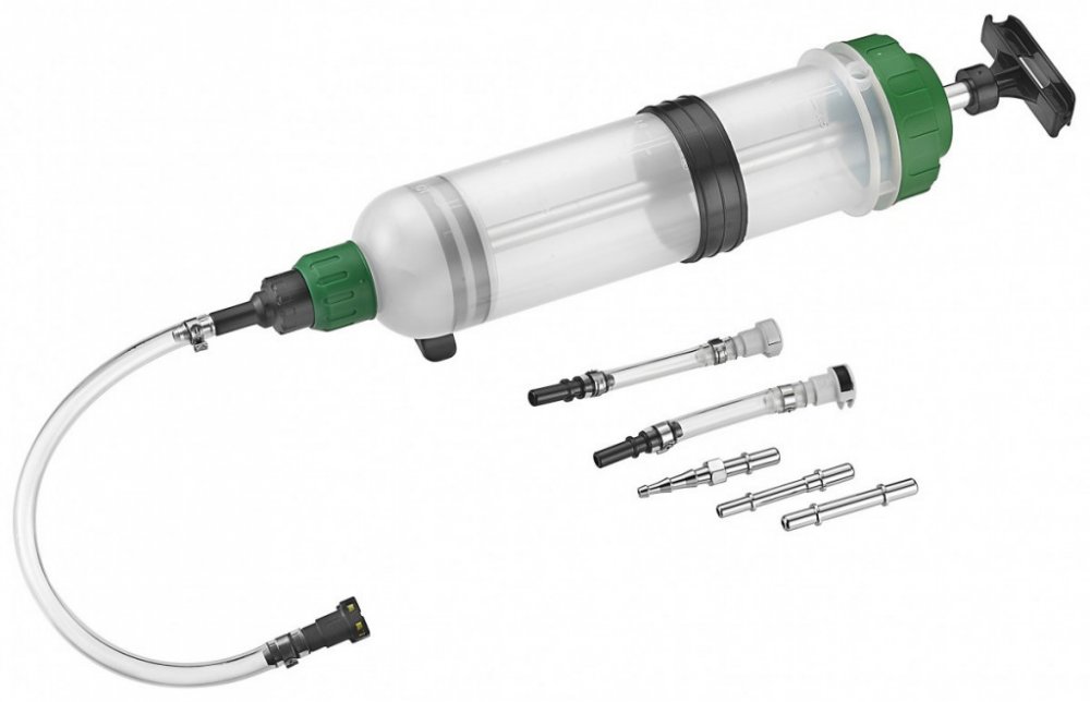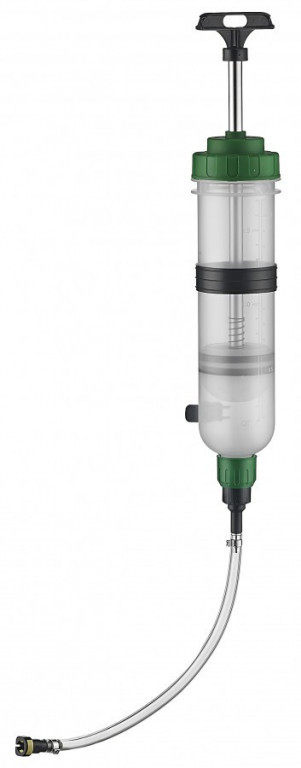 - Ruční plnička a odsávačka nafty a benzínu typu injekční stříkačka s obsahem zásobníku 1,5 l.