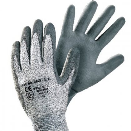 Pletené bezešvé rukavice s odolností proti řezu 3, dlaň a prsty povrstveny polyuretanem.