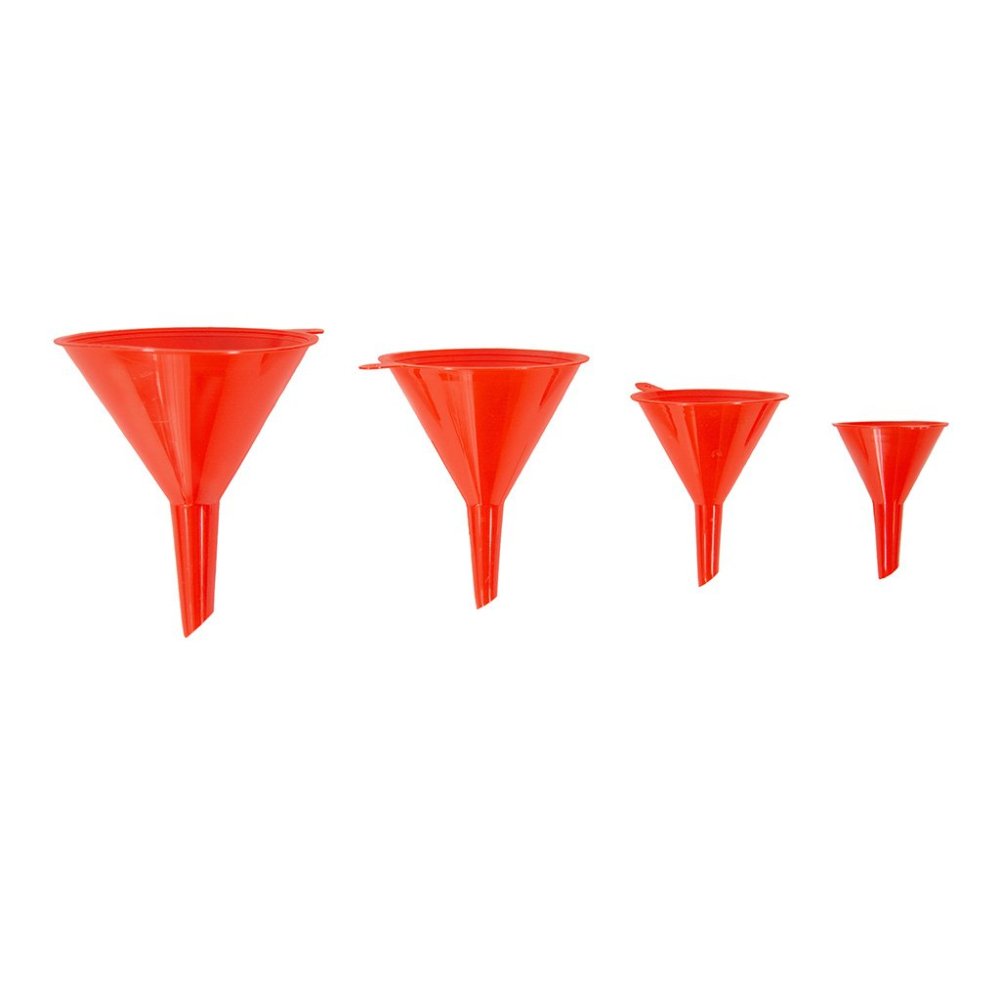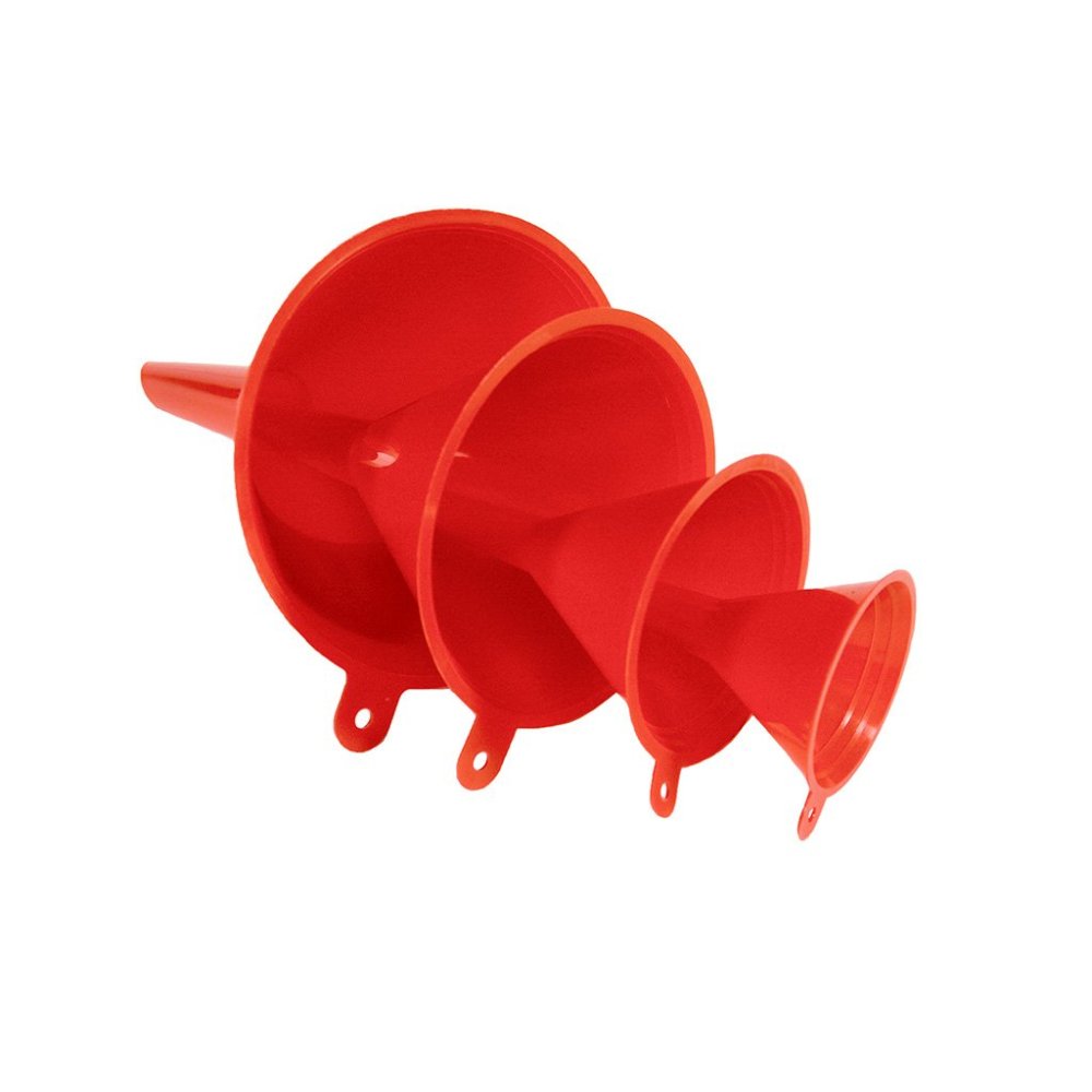 Sada 4 plastových trychtýřů se závěsným očkem obsahuje trychtýře s průměrem 55 mm, 75 mm, 100 mm a 115 mm.