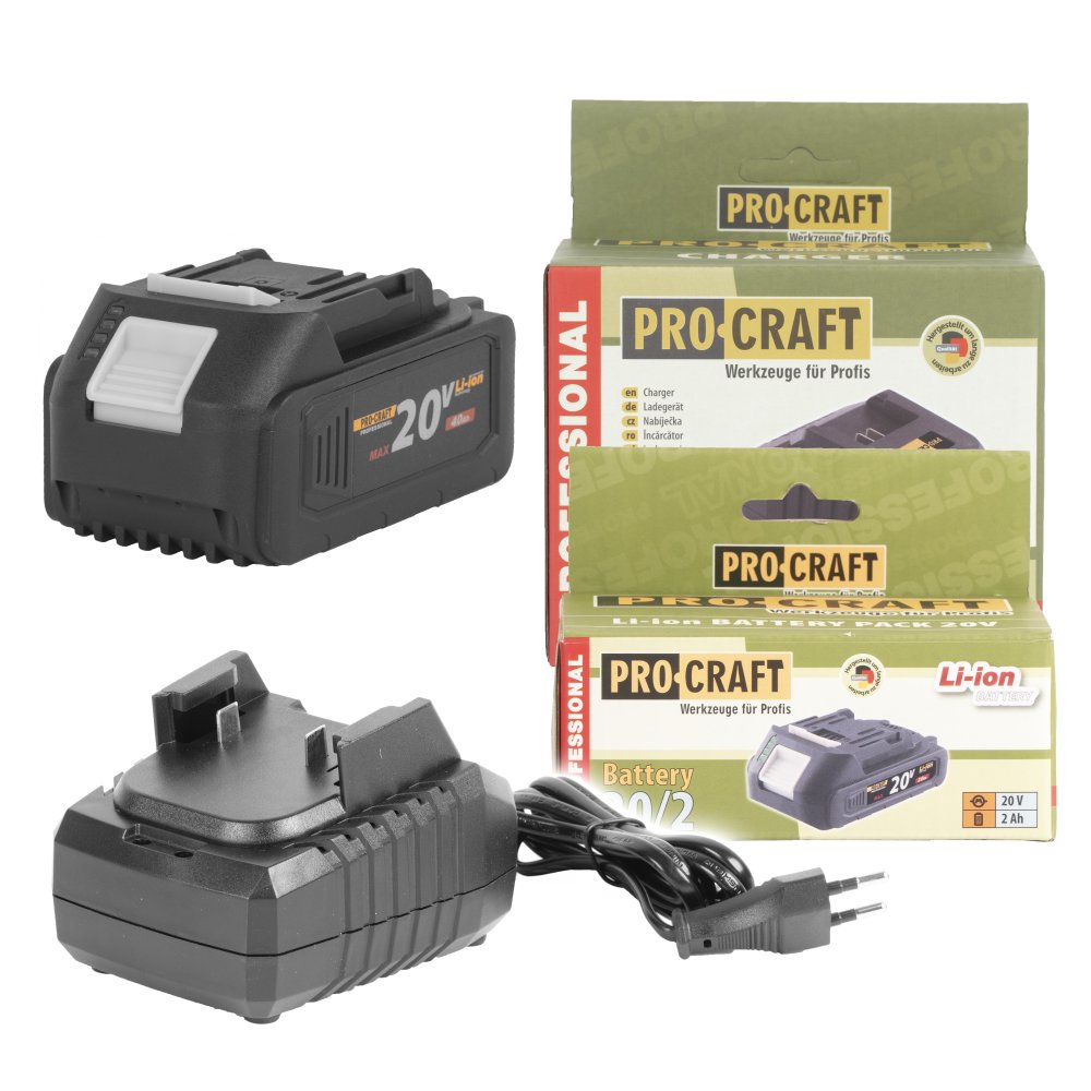 Sada obsahuje jednu baterie Procraft 20V 4Ah s ochranou proti přehřátí a vybití a nabíječku. Ideální doplněk pro nepřerušovanou práci s aku nářadím Procraft.