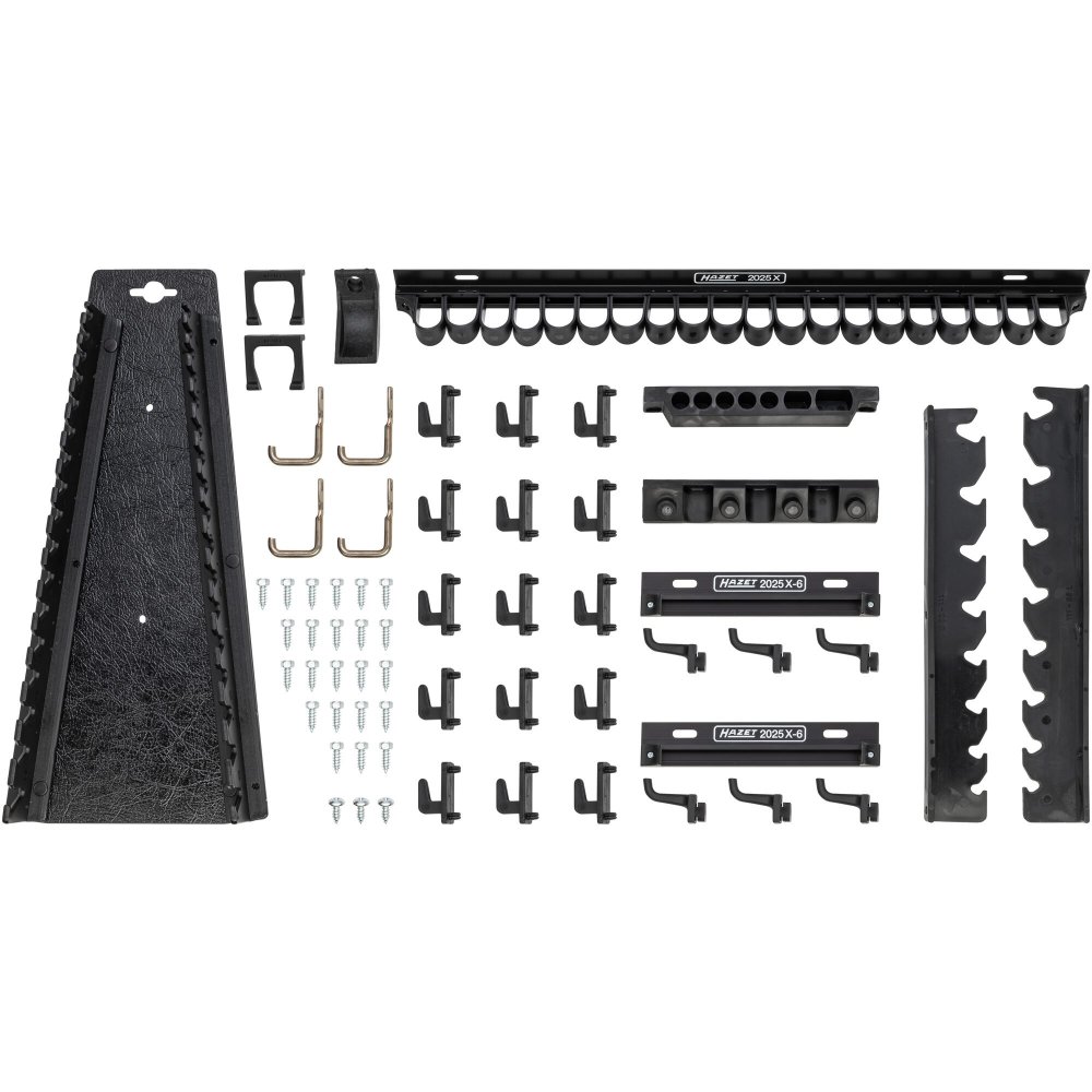 Sada 116 ks držáků a háčků nářadí určených pro děrované desky s roztečí 38 x 38 mm. Připevněním na perforovaný panel lze rozšířit úložný prostor také pro sestavy dílenského nábytku, dílenské vozíky s nářadím i bez nářadí, pracovní stoly i policové regály.