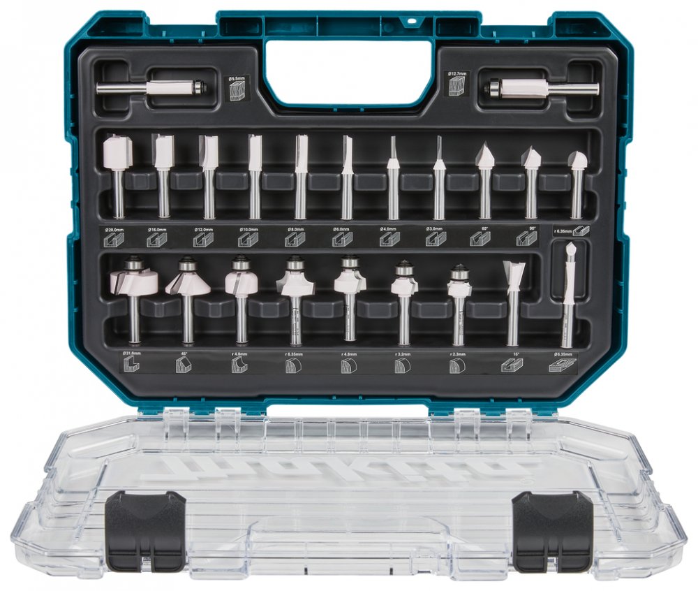 Sada fréz 22 ks v čirém plastovém pouzdře s průhledným víkem a průměrem stopky 8 mm. Maximální rychlosti jsou uvedeny na zadní straně pro každou frézu. Sada obsahuje: drážkovací fréza 2 řezné plochy 20 x 19 mm - 16 x 19 mm - 12 x 19 mm - 10 x 19 mm - 8 x 19 mm, drážkovací fréza 1 řezná plocha 6 x 19 mm - 4 x 13 mm - 3 x 13 mm, zaoblovací fréza s kuličkovým ložiskem R2.3 -R43.R43, fréza s kuličkovým ložiskem 45°, fréza na duté profily 12.7 x 10 mm R6.35, fréza na duté profily s kuličkovým ložiskem 22.2 x 12.7 mm R4.8, fréza na V drážky 12.7 mm 60° - 12.7 mm 90°, fréza na hrany s kuličkovým ložiskem 9.5 mm - 12.7 mm, rybinová fréza 15 mm, drážková fréza s kuličkovým ložiskem 31.8 mm, vrtací fréza 6.35x19 mm. Dodáváno v čirém plastovém kufříku s průhledným víkem, včetně indikace maximálních otáček na frézu.