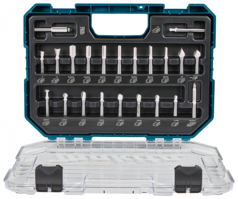 Sada fréz 22 ks v čirém plastovém pouzdře s průhledným víkem a průměrem stopky 8 mm. Maximální rychlosti jsou uvedeny na zadní straně pro každou frézu. Sada obsahuje: drážkovací fréza 2 břity 12 x 19 mm - 10 x 19 mm - 8 x 19 mm - 6 x 19 mm - 6 x 16 mm, drážkovací fréza 1 břit 6 x 19 mm - 5 x 13 mm, fréza na dutý profil 6.35 x 6.35 mm R3.2 - 7.9 x 8 mm R4 - 12.7 x 10 mm R6.35 - 9.5 x 9.5mm R4.8 - 6.35 x 12.7 mm R3.2 - 9.5 x 12.7mm R4.8, V-drážka fréza 12.7 mm 60gr - 12.7 mm 90gr, hranová fréza 9.5 mm, rybinová fréza 12.7 mm - 9.5 mm 9.5 mm, vrták 6.5 mm - 6.3 mm fréza, fréza na klíčové dírky 9.5 mm, kulová fréza 9.5 mm R4.8