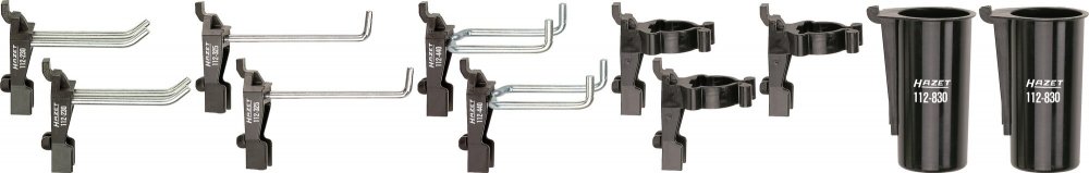 Sada 11 ks háků a držáků je určena pro děrované desky s roztečí 38 x 38 mm. Připevněním na perforovaný panel lze rozšířit úložný prostor také pro sestavy dílenského nábytku, dílenské vozíky s nářadím i bez nářadí, pracovní stoly i policové regály.