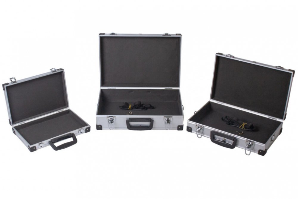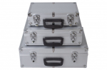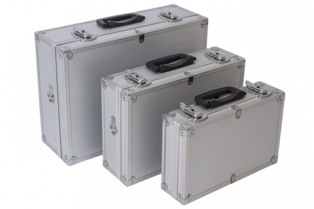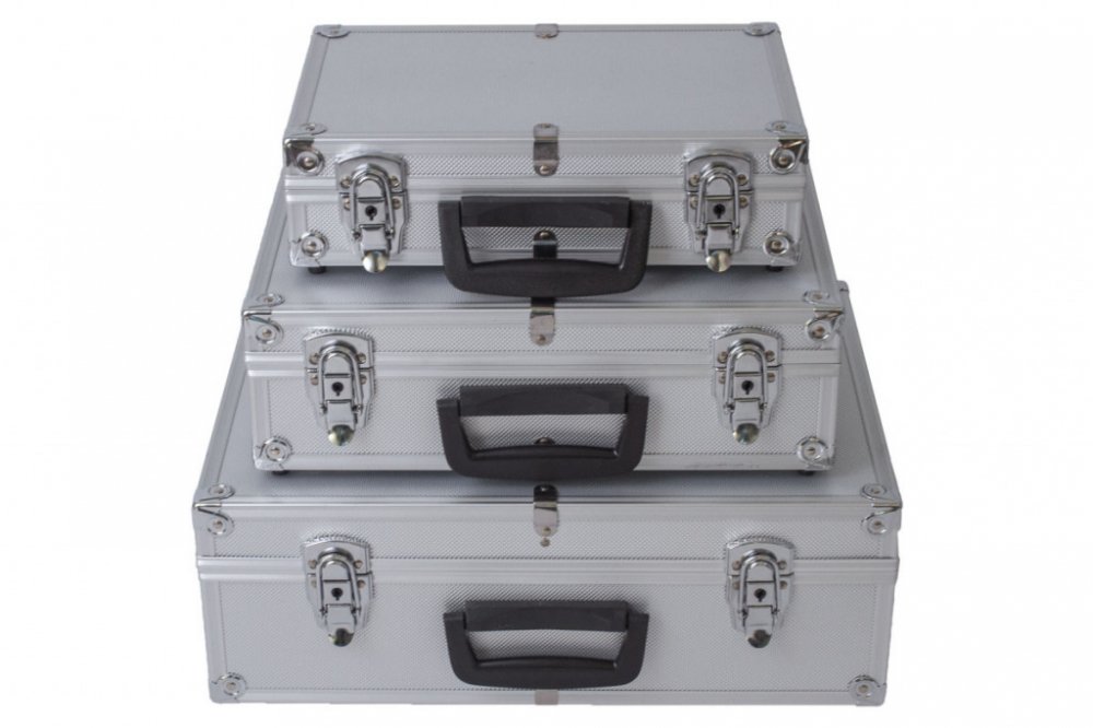 Sada tří hliníkových kufrů, které lze uskladnit do sebe. Kufry jsou lehce přenosné díky madlům. Ke dvou větším kufrům lze připnout popruh na ramena.