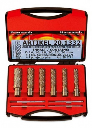 Sada šesti špičkových vrtáků a dvou středících kolíků řady Karnasch GOLD-LINE 55 v praktickém kufru.