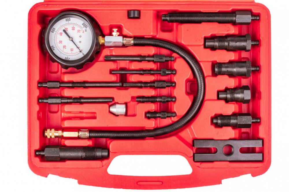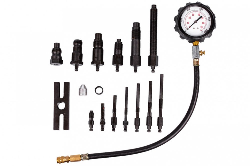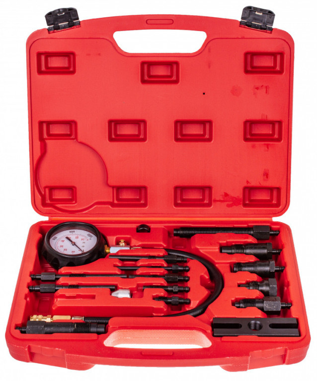 Sada pro měření komprese dieselových motorů s maximální hodnotou 70 bar. Sada obsahuje adaptéry pro připojení měřiče k většině vznětových motorů běžných značek automobilů. Souprava obsahuje manometr s maximálním rozsahem do 70 barů, prodlužovací adaptér, 10 adaptérů pro připojení přes žhavící svíčky motoru,4 adaptéry pro připojení k motoru přes vstřiky a montážní přípravek tvaru H. Vyrobeno z oceli C45. Souprava je uložena v plastovém kufru s prolisy pro snadný přenos a přehledné uložení součástí sady.