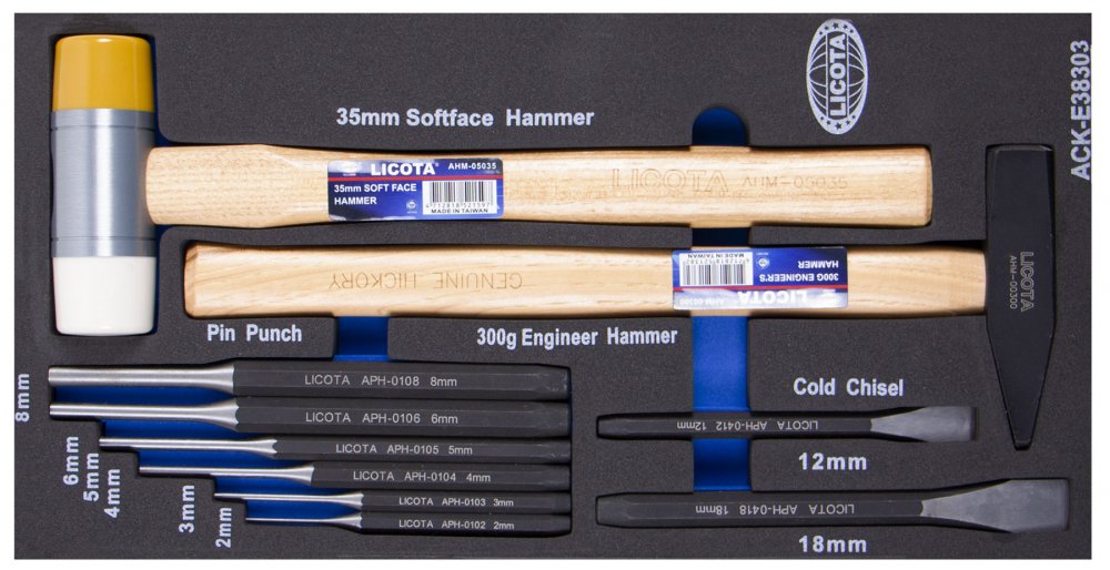 Sada 10 ks profesionálních vyrážečů, sekáčů, kladiva a paličky v pěnové výplni pro nejnáročnější použití.