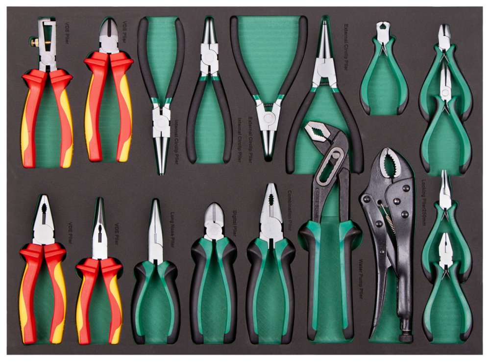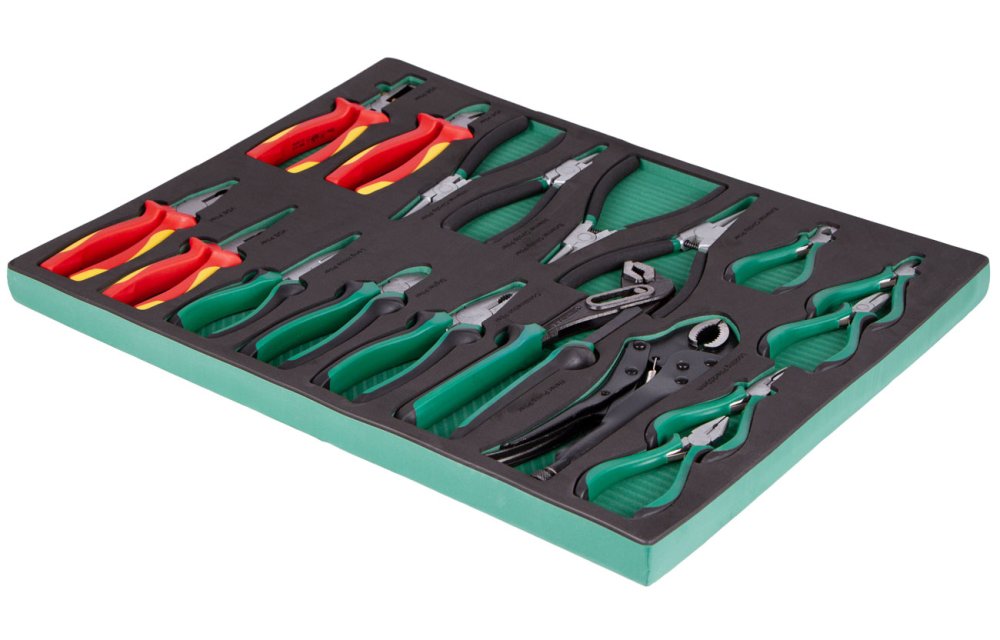 Rozsáhlá sada standardních, mini i VDE kleští pro široké spektrum mechanických, montážních a elektrotechnických prací – přehledně uložená v pěnové výplni pro dílenské vozíky.