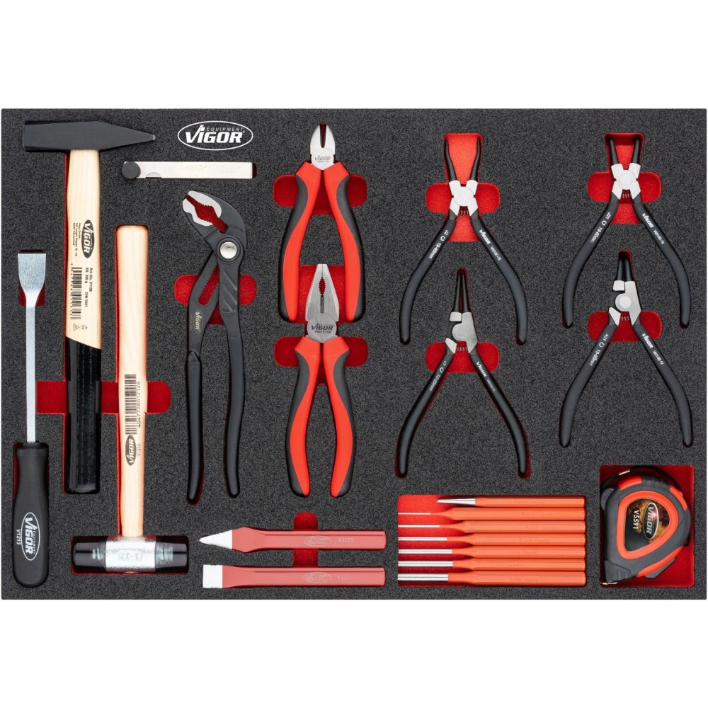 Nezařazeno » Sada kleští, kladiv a dlát v pěnové výplni, 21 ks, VIGOR - V5637N