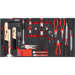 29 kusů nářadí v sadě kleští, kladiv a dlát ve výplni do dílenského vozíku. Snadno omyvatelné, odolné vůči olejům a tukům. Rozměr 750 x 393 x 35 mm.