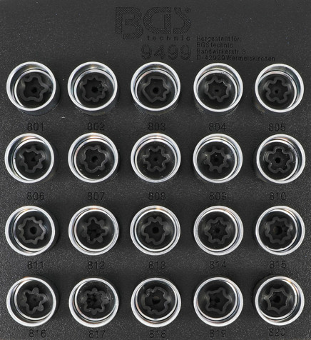 Sada 20 ks klíčů v pěnové výplni na kola Audi s bezpečnostním profilem je základem pro sejmutí šroubů a kola bez jeho poškození.