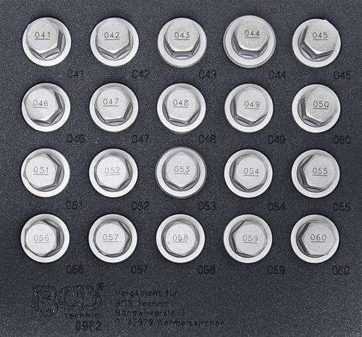 Sada 20 ks klíčů v pěnové výplni na kola BMW s bezpečnostním profilem je základem pro sejmutí šroubů a kola bez jeho poškození.